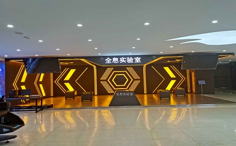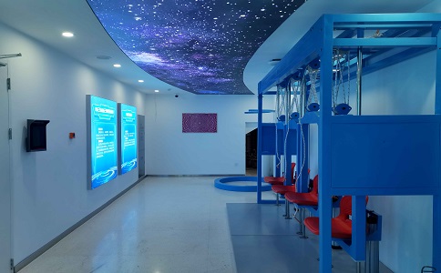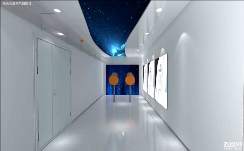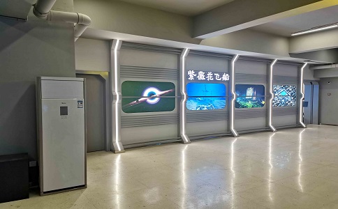 采用160°水平視角環(huán)幕, 24㎡超大觀(guān)影體驗(yàn),支持300萬(wàn) 面超大規(guī)模虛擬現(xiàn)實(shí)場(chǎng)景實(shí)時(shí) 漫游,4160*1440 屏幕分辨率 高清數(shù)字媒體播放。墻上展現(xiàn) 了紫薇花飛船的編年史,增加 科技感。